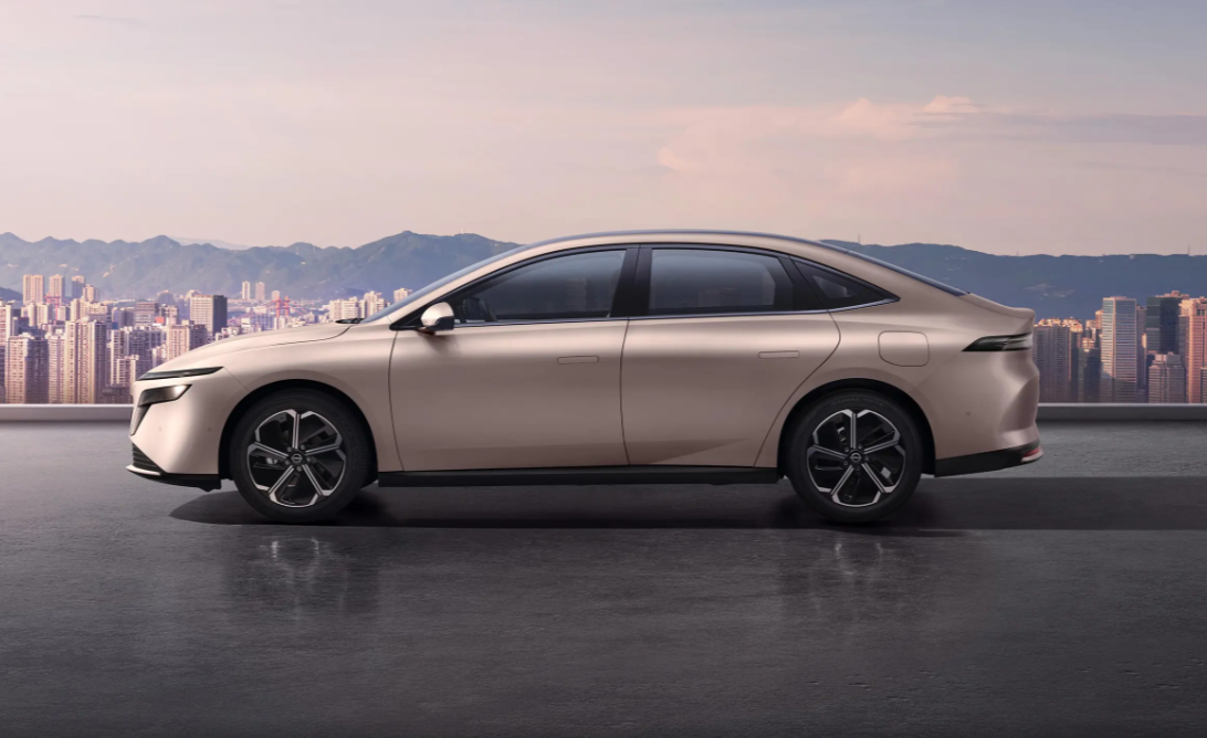 车身侧面采用带有溜背造型的三厢车造型,造型简约时尚又实用,车身长度4831mm,轴距2815mm,车身尺寸小于日产N7,隐藏式门把手与车身融为一体,再加上花瓣状低风阻轮毂,俨然就是一款新能源车型,很多设计都考虑到降低车身风阻系数。为了丰富车身视觉效果,从前大灯部分向后延伸出一条腰线,造型简约又有辨识度。