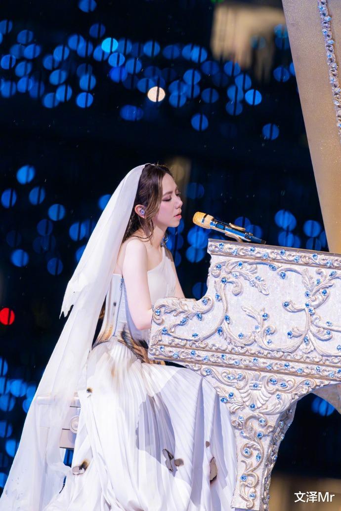 头纱的斑驳破损,暗合她曾在纪录片中落泪坦言:“完美是假象,伤疤才是勋章。”侧身演唱时,破损处被灯光镀上金边,仿佛回应着她《天空没有极限》的歌词——所有裂痕,都是光进来的地方。