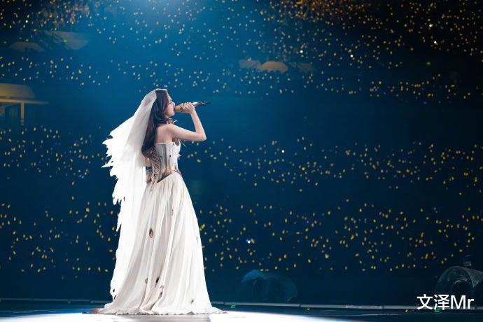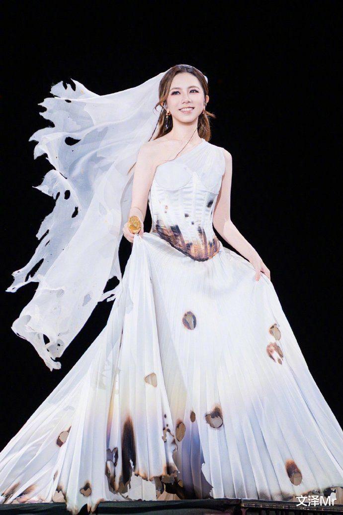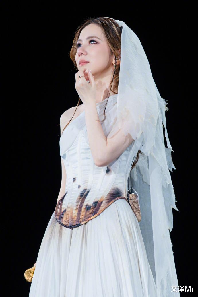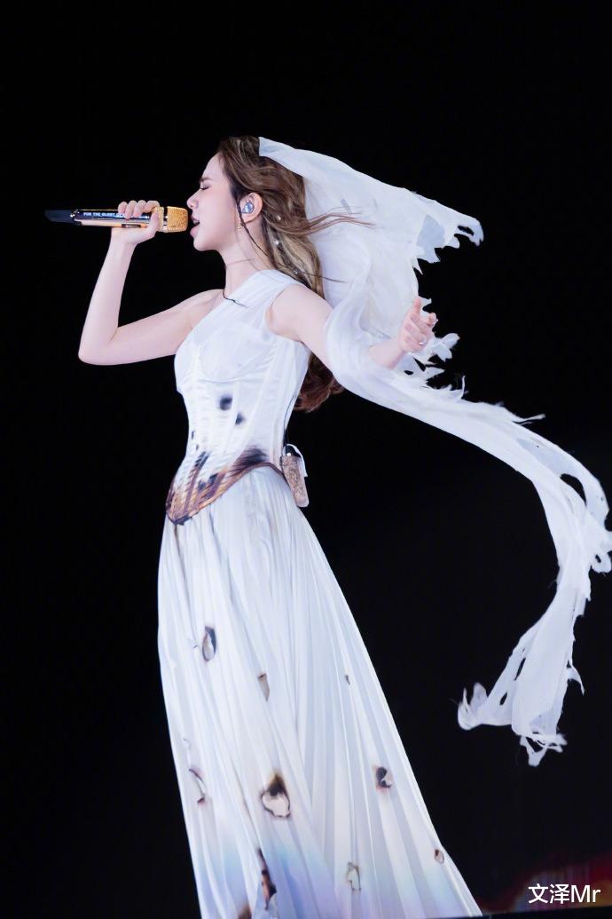 当追光灯打向舞台中央,头纱白裙的邓紫棋宛如暗夜新娘。褶皱裙摆随着演唱动作荡开波纹,那些看似灼烧的裂痕竟在灯光下泛出鎏金光泽。她紧握麦克风投入演唱的模样,让人想起她曾说:“舞台是我的教堂,音乐是我的祷告。”