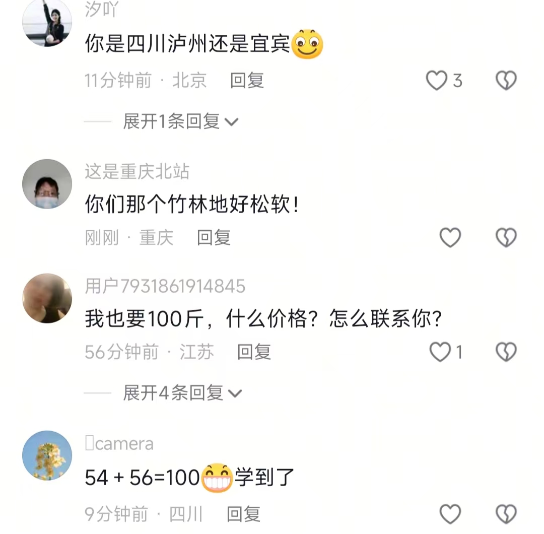 本来以为最有意思的是挖笋的热闹,结果点开评论区,我和小伙伴都惊呆了。有人直接拿甘二娃乱挖别人笋被追责的事调侃,问他都出了这事儿了还敢随便挖?不是吧?真的假的?还有人追着问能不能随便进山挖,黄颠笋跟普通笋到底有啥区别,更有人直呼一块钱一斤也太便宜,深圳带皮都要十三块一斤,这差价直接给我看麻了。