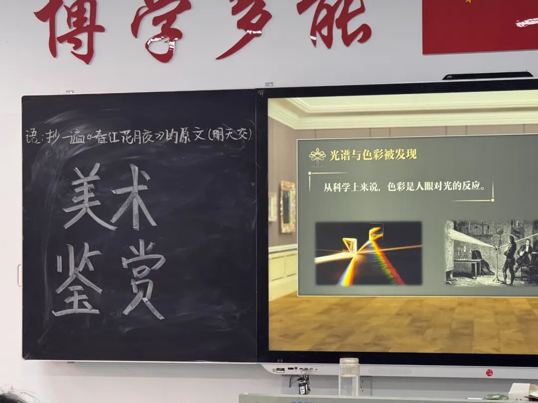 课堂上,大屏展示的中外经典画作、老师生动的现场讲解,营造出沉浸式的艺术氛围;学生们积极分享对作品的见解 —— 有人偏爱《清明上河图》的市井烟火,有人沉醉《蒙娜丽莎》的神秘微笑,思想的碰撞让审美视野不断拓宽。在这里,艺术不再是遥不可及的 “高雅殿堂”,而是每个学生都能参与、都能感知的精神滋养。