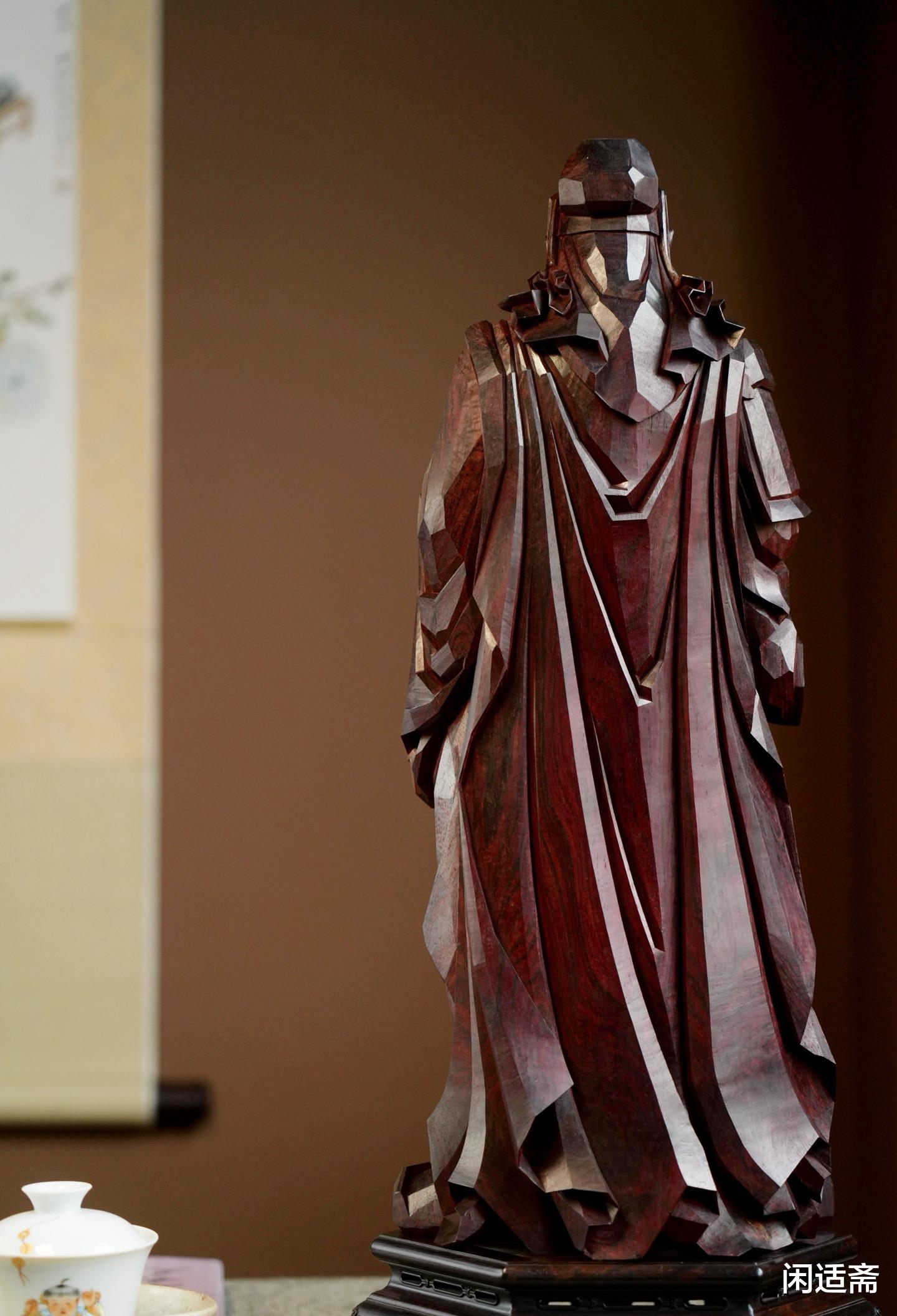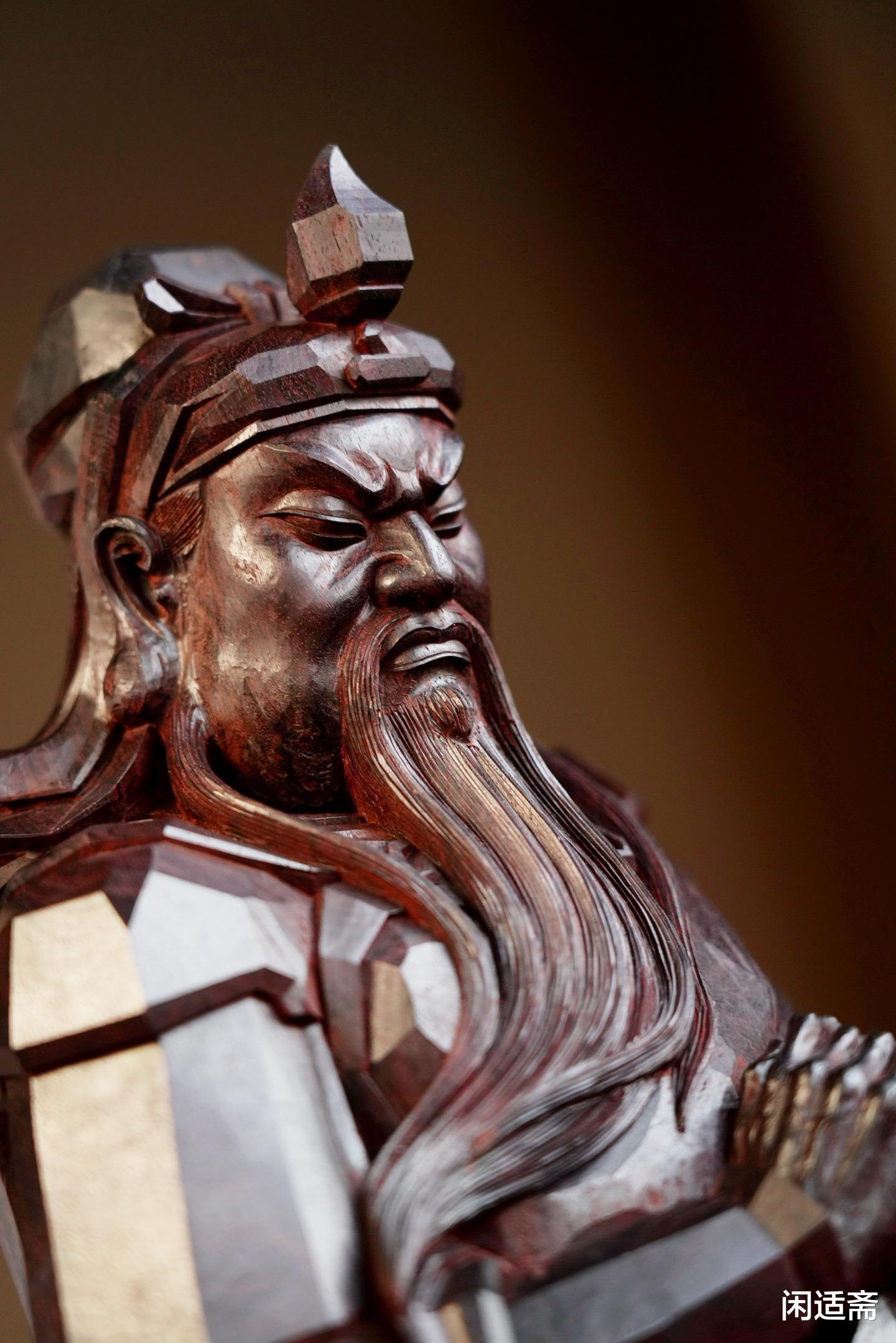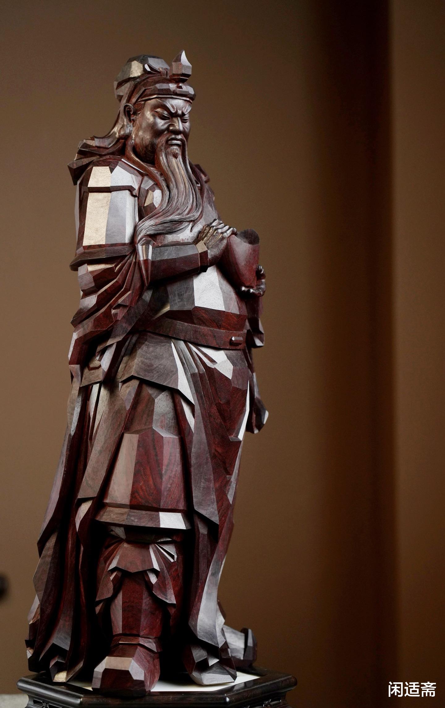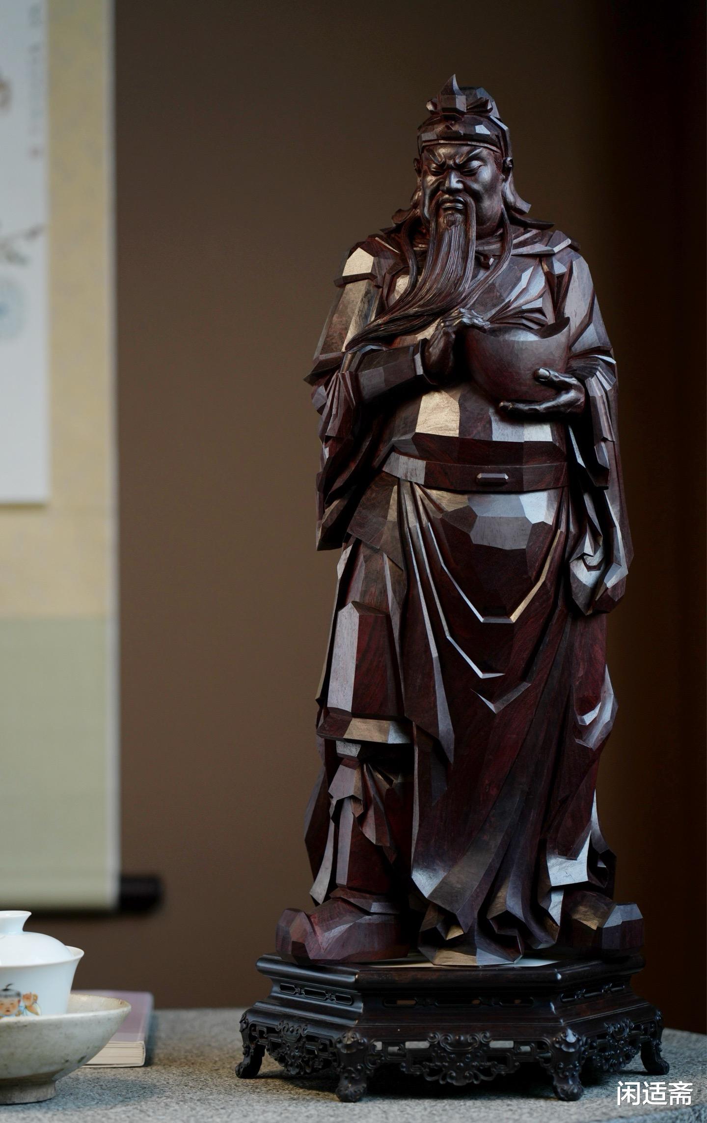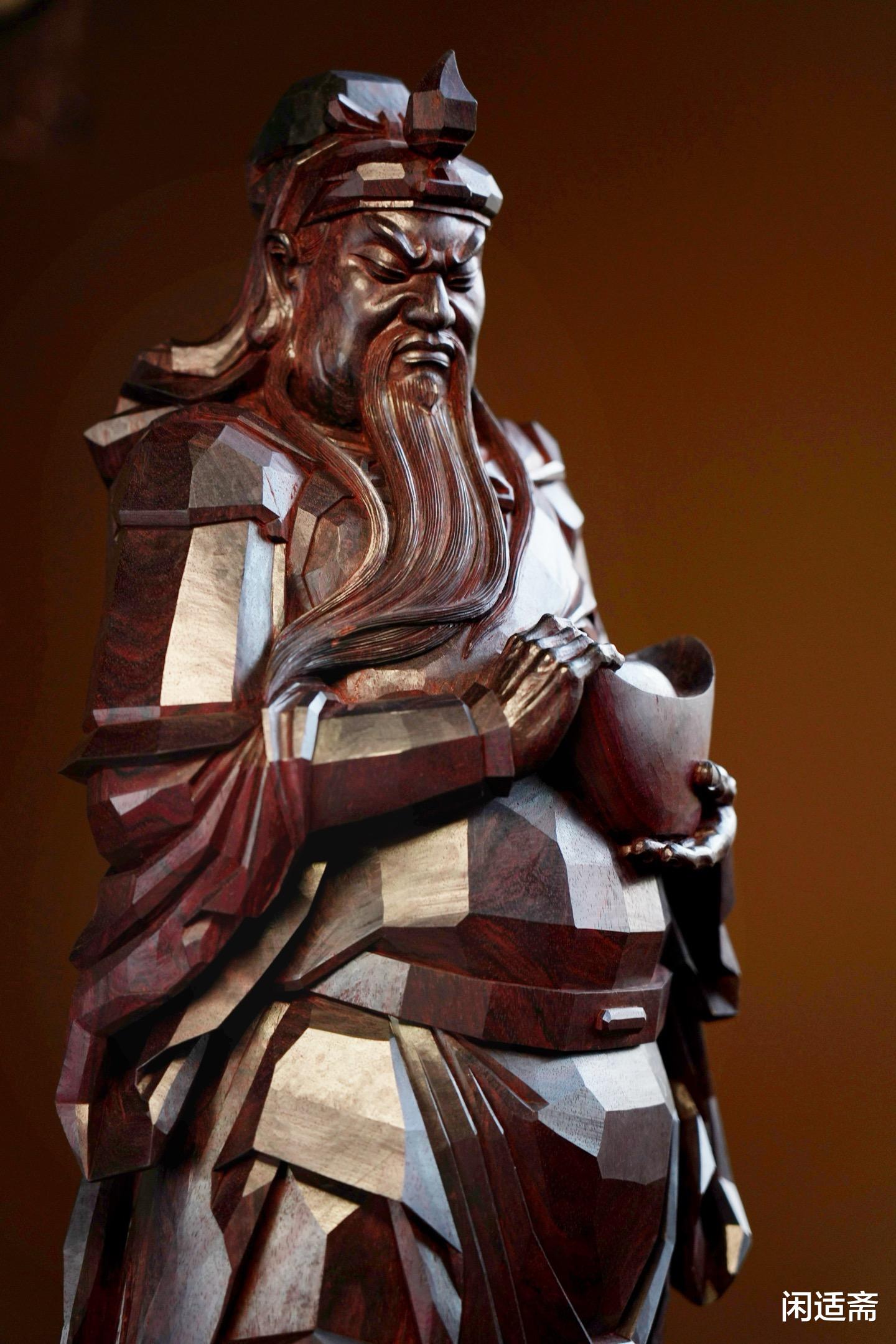 核心亮点在于 “快刀雕刻技法” 的极致运用:匠人以 “劈斫老辣” 的刀法直抵材质内核,刀锋走向干脆利落,无拖泥带水之感,却又内蕴章法 —— 每一刀都精准贴合关公的形态结构,或勾勒衣袂的褶皱,或刻画面部的轮廓,或雕琢盔甲的纹路,通过鲜明的棱角质感,将关公的刚正不阿与凛然正气具象化。
