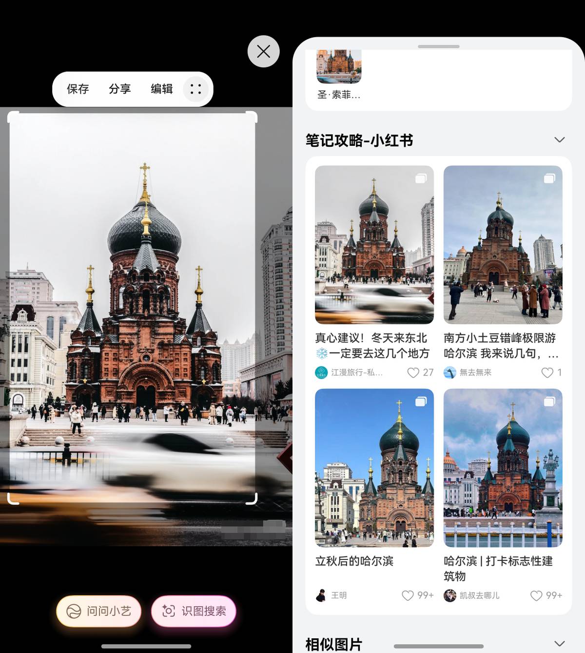 除了这个新功能,小红书圈粉我的还有另一个功能,就是“圈选图片搜笔记”,作为鸿蒙5老用户,我可是早就用上了!当你在哈尔滨看到一座地域风情浓厚的建筑,随手拍照圈选,点击“识图搜索”,秒认出这是索菲亚大教堂,还能获取小红书上的相关拍照攻略和打卡推荐!户外这么冷的天,哆哆嗦嗦用手机搜攻略真的太难,如此减少操作步骤,冰雪天也能玩转哈尔滨!