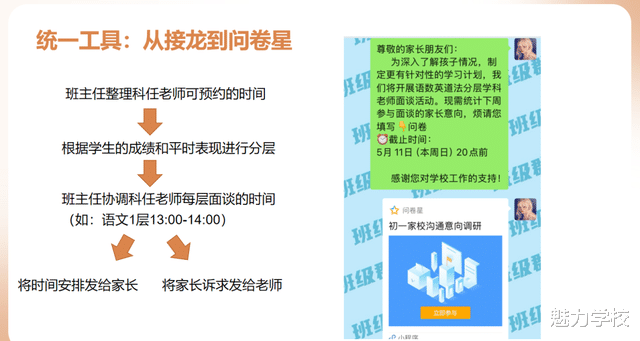 初二(4)班班主任李可佳老师代表初二年级以主题为:家校共育新桥梁——分层预约式家长会的经验,从四个方面分享在初一时年级组织家长会的经验和反思。