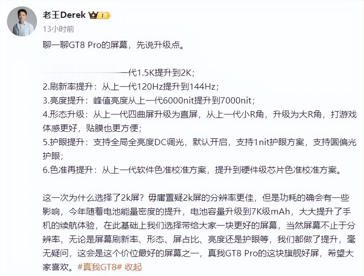 对于为何选择2K屏的问题,王伟指出,2K屏的分辨率更佳是毋庸置疑的,但功耗的确会有一些影响。今年随着电池能量密度的提升,电池容量升级到7K级mAh,大大提升了手机的续航体验,在此基础上选择带来一块更好的屏幕。