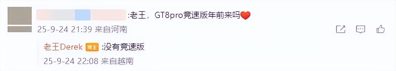 有网友今晚询问“GT8pro 竞速版年前来吗”,王伟回应称“没有竞速版”。