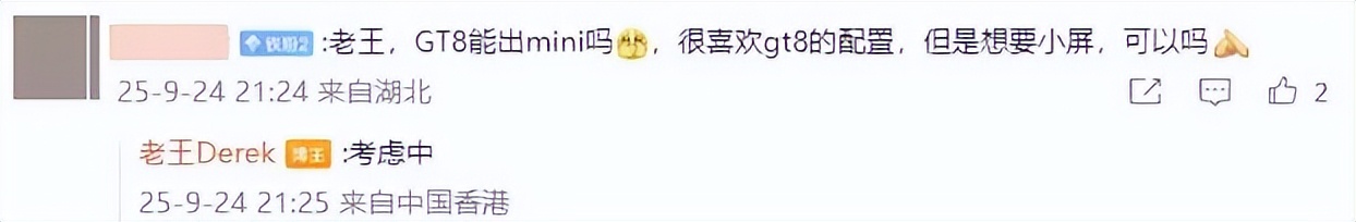 还有网友表示“GT8 能出 mini 吗,很喜欢 gt8 的配置,但是想要小屏,可以吗”,王伟则表示“考虑中”。