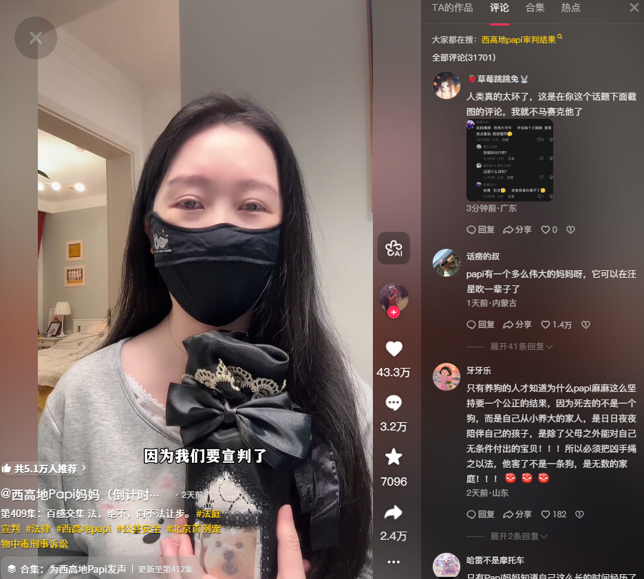 她遭遇了证据收集难、宠物价值司法鉴定体系空白、精神损害赔偿主张支持难,甚至持续的网络暴力。案件本身也历经9次延长审限,耗时两年多。她的坚持,不仅仅是为“Papi”讨公道,更是如她所说,“关乎着千千万万‘毛孩子’的安全、动物伴侣的福利、千千万万的养宠人以及千家万户的公共安全问题”。这个判决,是对这份坚持的一种司法回应,它告诉所有受害者,此类极端行为有被严肃追究刑责的可能。