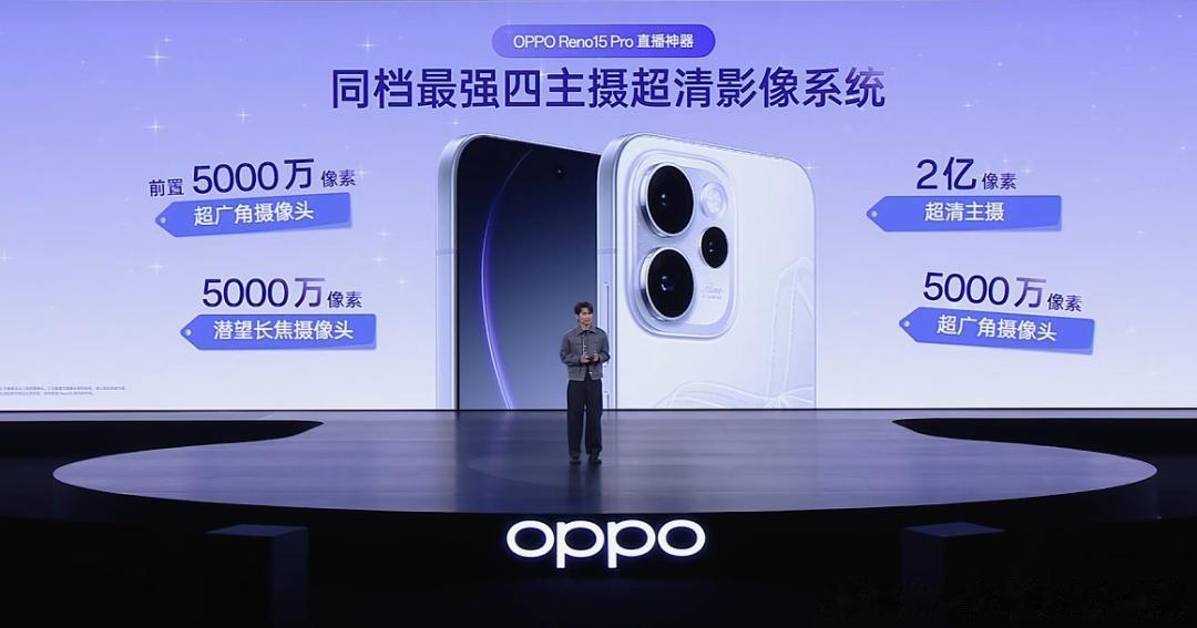 四主摄超清影像系统 + 全场景实况玩法打造“超出圈的实况神机”Reno15 与 Reno15 Pro 均搭载由 2 亿像素超清主摄、5000 万像素潜望长焦、5000 万像素超广角及前置 5000 万超广角摄像头组成的同档最强四主摄超清影像系统,无凑数镜头,全焦段都清晰,覆盖从远景到自拍的全场景拍摄需求。