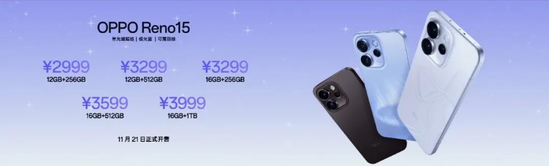 全新Reno15系列11月21日正式开售OPPO Reno15 Pro 提供星光蝴蝶结、蜜糖金、可露丽棕三种配色,12GB+256GB版本定价 3699 元;12GB+512GB 版本定价 3999 元;16GB+512GB 版本定价 4299 元;16GB+1TB 版本定价 4799 元。