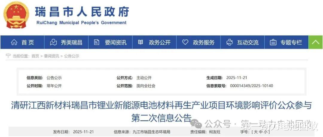 第一动力电池回收消息,近日,江西省瑞昌市人民政府官网发布了《清研江西新材料瑞昌市锂业新能源电池材料再生产业项目》环境影响评价公众参与第二次信息公告。