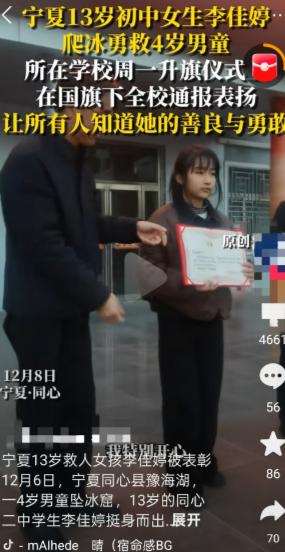 近日,宁夏同心县第二中学初一学生李佳婷的事迹温暖了无数人。她获得了学校的见义勇为证书,也被阿里公益授予“天天正能量特别奖”及5000元奖金。赞誉纷至沓来,人们惊叹于她的勇敢,也感动于她事后那份超越年龄的低调与担当。
