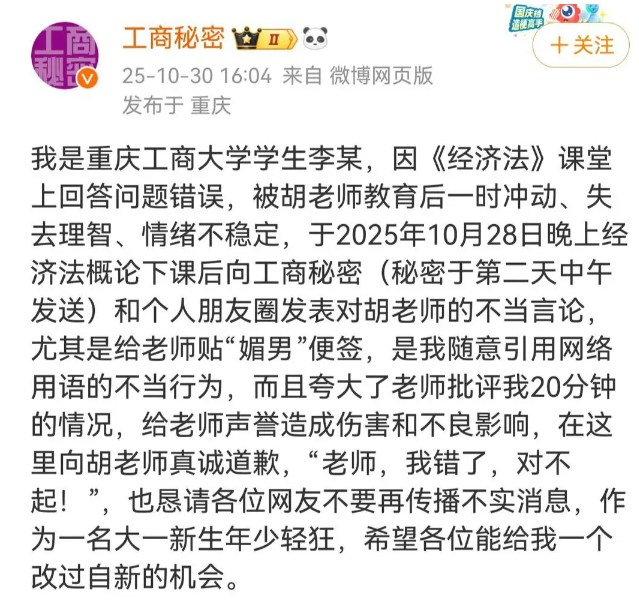 10月28日,重庆工商大学法学与社会学学院《经济法》课堂上,大一新生李某因抽背环节表现欠佳,与授课胡老师产生冲突。这场看似寻常的教学摩擦,经网络发酵后演变成一场关于师生边界、网络言论尺度与法律责任的公共讨论。