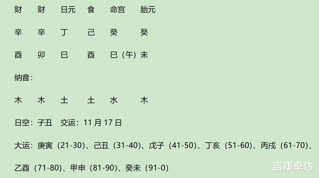 大运丁比生己伤,己伤生辛偏财,辛偏财制乙偏印;大运亥合小限卯,流年亥与时支酉夹戌。