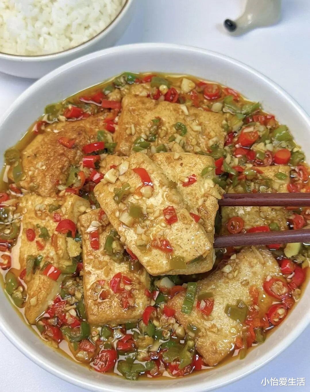 懒人流程:1 定型——老豆腐切1cm厚片,厨房纸吸干水,热锅少油,中小火煎至两面金黄,先盛出;2 炒香——余油里下蒜末+1大勺豆瓣酱,小火炒出红油,加半碗清水、半勺糖、1勺生抽,轻轻搅匀;3 回锅——豆腐回锅,用勺子背轻压,让汤汁钻进孔里,小火咕嘟3分钟,撒葱花,搞定。外壳微韧,内里爆汁,豆瓣酱的酱香裹着豆香,拌饭三碗起步。技巧:煎完豆腐先关火,锅温降一点再下豆瓣酱,红油不会被高温苦化;想减盐,酱油减半,味道依旧在线。
