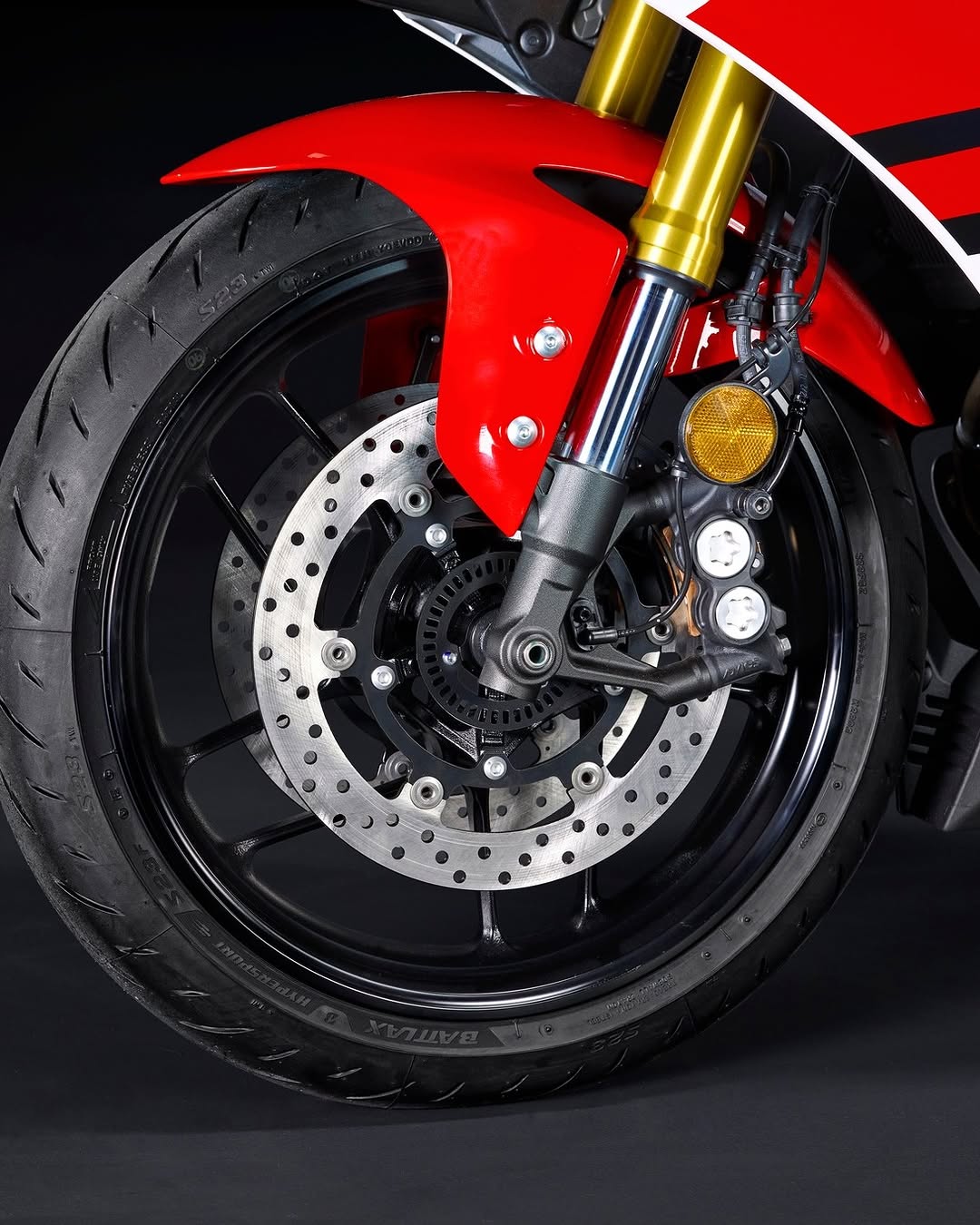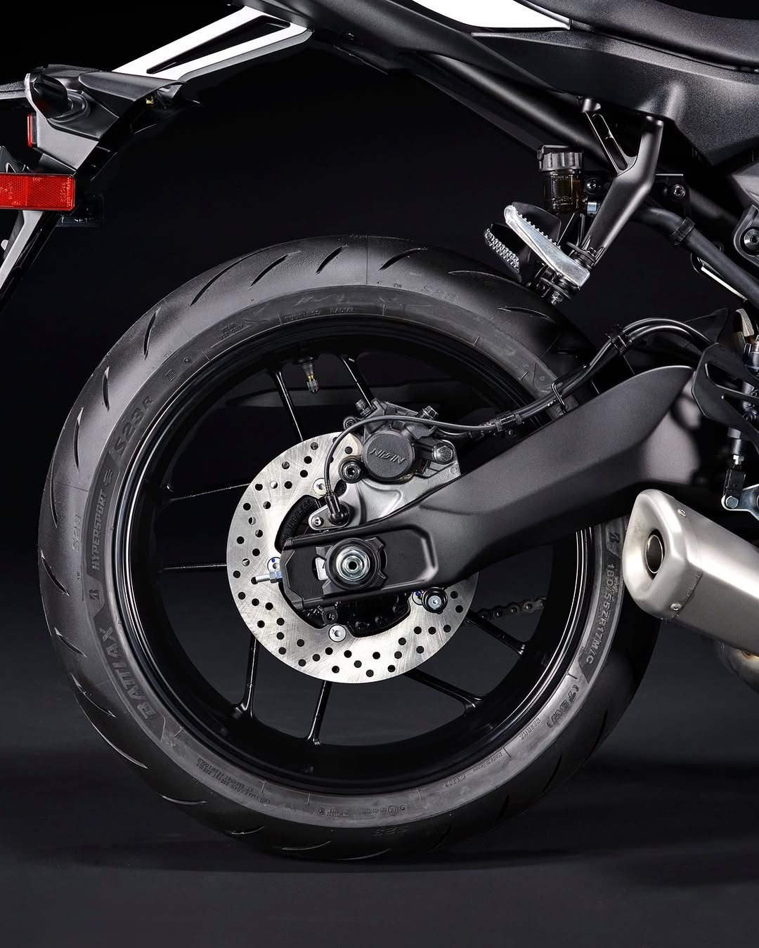 新款雅马哈YZF-R7的新车架大幅提升了扭转、纵向及横向刚度,后摇臂经调整后增强了路感反馈,为骑士提供了更加精准和稳定的操控体验。前叉采用41毫米倒置可调结构,活塞杆升级为铝制,减重0.8磅,进一步提升了车辆的操控性和响应速度。制动系统保留了前双298mm碟盘+四活塞卡钳,后单245mm碟盘的配置,确保了在不同路况下的稳定性和安全性。