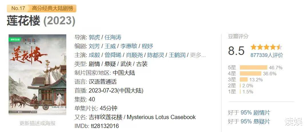 武侠剧持续探索新表达一直以来,武侠剧都广受观众的喜爱。随着用户内容审美的升级迭代,传统武侠剧已然不能满足当下的视听需求,因此近年来不少作品开始探索武侠剧的创新表达方式。豆瓣评分8.5的《莲花楼》、在社交平台持续破圈讨论的《赴山海》等作品,不仅收获市场热议和观众喜爱,也在商业化层面展现出极大的潜能,如《赴山海》未播之时便吸引了60余家品牌前来合作,《莲花楼》则展现出超长的长尾效应,如今仍在开发舞台剧等同名衍生内容。