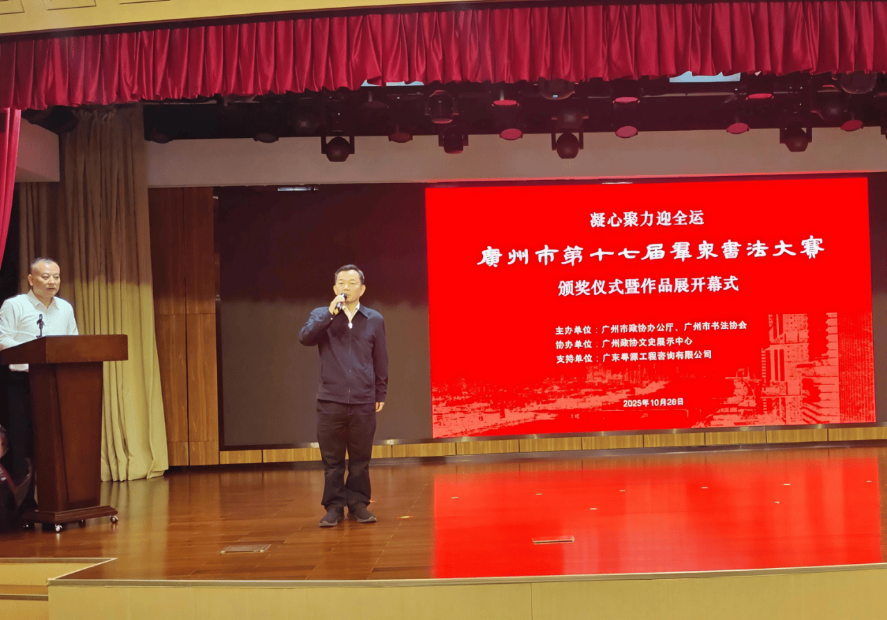 广东省书法家协会原副主席、广州市书法协会会长陈春盛在致辞中回顾了广州市书法协会自1981年成立以来,在弘扬中华优秀传统文化,推动书法艺术的普及与发展方面取得的辉煌成就。针对本次大赛,他特别指出几大亮点:一是参赛作者地域分布广泛,充分体现了活动的广泛参与性;二是参赛作品数量达到1128件,创历史新高,展现出浓厚的群众创作热情;三是作品整体水平高,其中不乏中国书法家协会会员的精品力作;四是比赛影响力显著,通过全国性书法平台发布征稿启事,进一步扩大了活动影响范围。陈春盛会长向广州市政协办公厅、广东省书法家协会等单位为本次大赛提供的悉心指导与大力支持表达衷心感谢,并对下一届书法大赛的举办成功表达了坚定的信心与热切期盼。