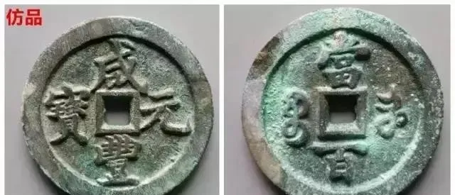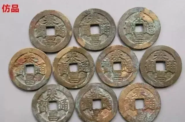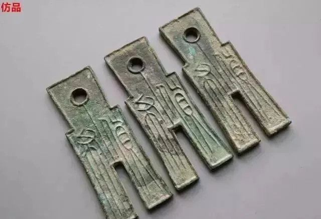 “传世锈”直观和古钱本色并没太人区别,伪造者利用与古钱近期的廉价钱币或翻砂重铸传世品,使得真假难辨。所以在鉴别时应从文字入手,观其有无神韵,也要听听有无转音,因为新铸币有火气,它的就有转音,用了很久的钱掷于地就无转音,以此可以判断真伪。