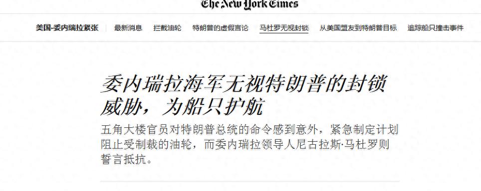 据《纽约时报》核实报道,委内瑞拉海军于16日、17日分两批次护送三艘油轮驶离本土,前往亚洲市场。由于三艘船未被列入美国现行制裁名单,所以美军没有对它们实施拦截。