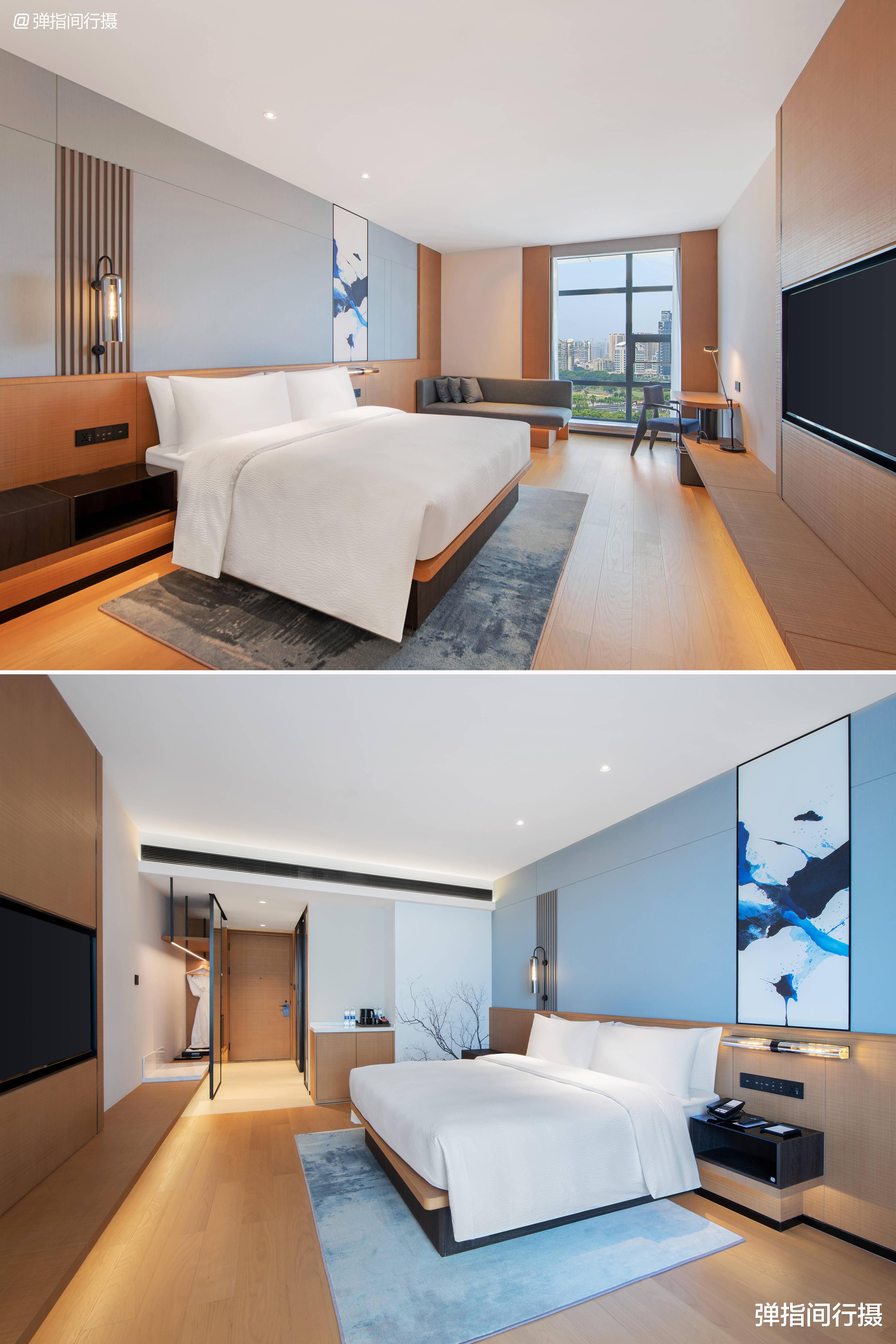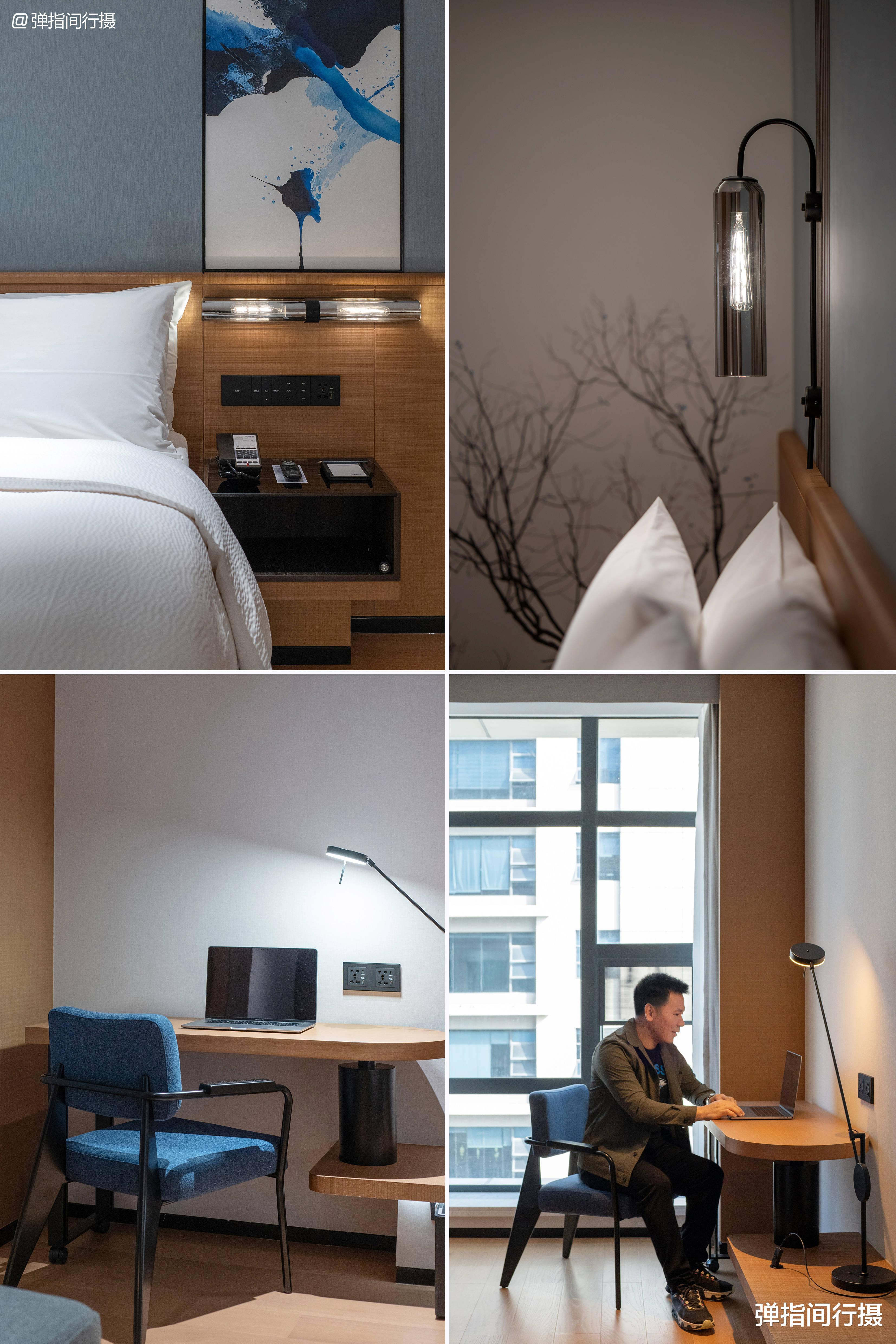 酒店拥有多种房型,我这次入住的是臻选大床房。房间延续了酒店整体的简约风格,空间宽敞明亮,原木主色调搭配蓝灰地毯,营造出温馨舒适的旅居氛围。临窗设置的休闲沙发和办公桌对商务客非常友好,既能高效工作,也能静享休憩。尤其值得一提的是床品,软硬适中,特别舒服,让我享受了难得的一夜好眠。