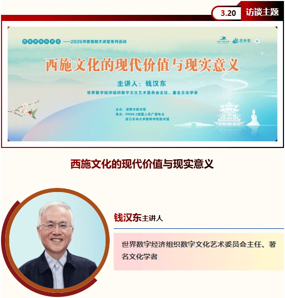 感谢各位朋友对诸暨市图书馆主办,FM98.2诸暨人民广播电台承办的“跟着西施来阅读”——2026书香暨阳大讲堂系列讲座活动的关注!