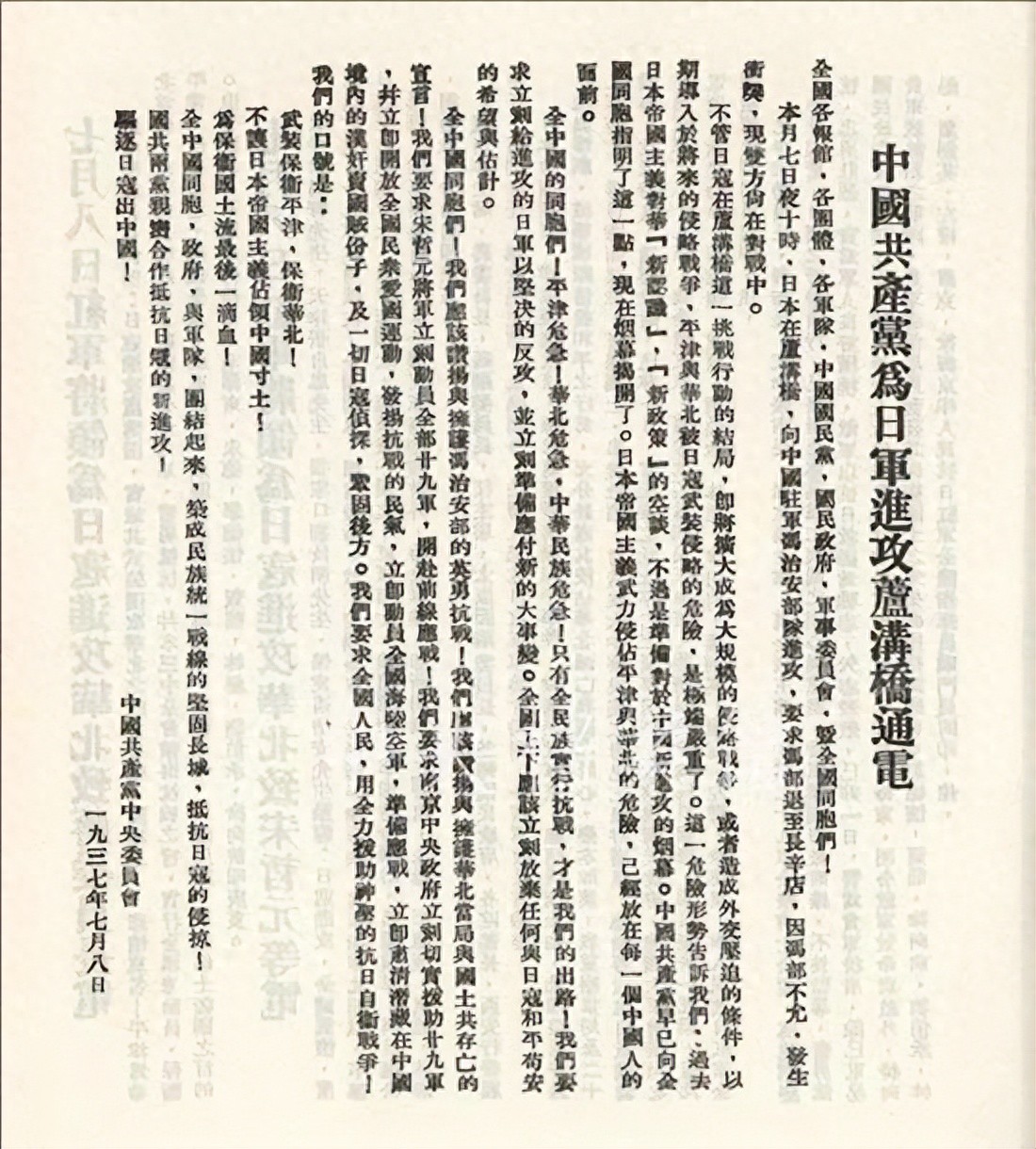 两天后,中共中央致电国民政府,表示红军“愿即改名为国民革命军,并请授命为抗日前驱,与日寇决一死战”。