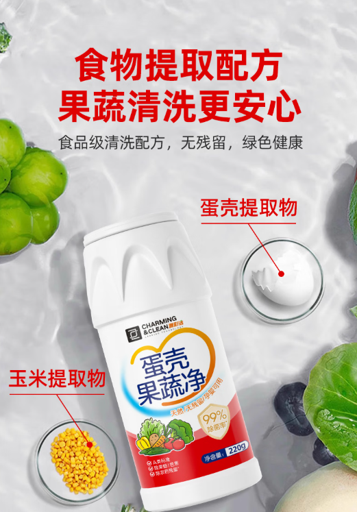 更值得一提的是,主流蛋壳果蔬净的成分表都极为干净,基本以蛋壳提取物、胶岭石(天然矿物,常用于药品中)、玉米提取物为主,达到A类食品级标准,即便微量残留也无需担心安全问题,孕婴家庭可放心使用。对比洗洁精依赖表面活性剂去污的方式,蛋壳果蔬净从源头避免了化学残留风险,清洗后果蔬还能保持原本的清甜口感。