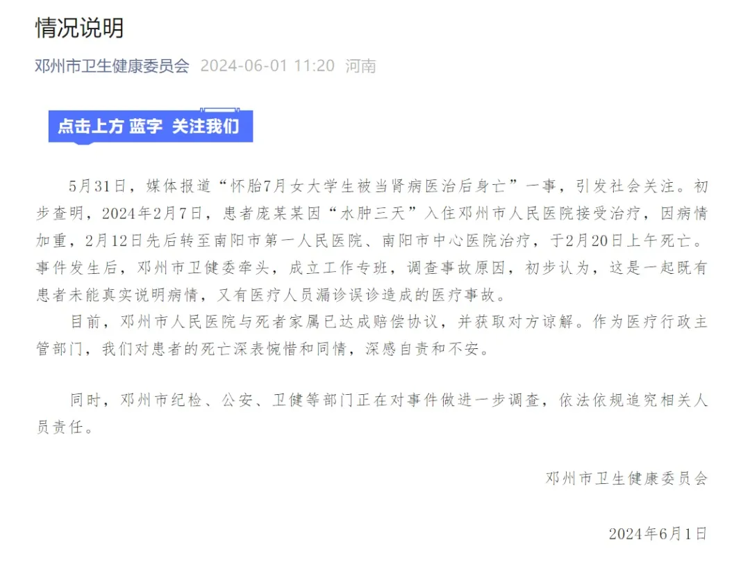 据报道,患者庞某某因水肿入住邓州市人民医院,后转至其他医院,不幸身亡。初步查明,这是一起因患者隐瞒怀孕和医疗人员漏诊误诊导致的医疗事故。患者为何隐瞒怀孕?是觉得难以启齿还是有其他原因?医院为何没有及时排查?是医生判断失误还是患者多次隐瞒?育龄期妇女入院激素检查是否会成为常规项目?这起医疗事故的责任应由谁承担?患者在就医时应如实告知医生自己的病情和病史,这是建立医患信任的基础。而医生在接诊时也应进行充分的排查以获得明确的诊断结果,同时防范过度医疗。