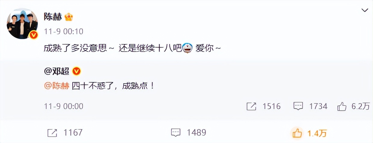 超哥跟赫哥说已经四十岁了,以后要成熟点,而赫哥也是幽默的回复道:“成熟多了没意思~还是继续十八吧。”