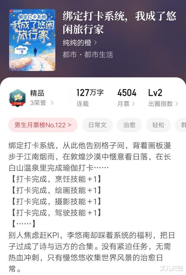 对了,下午发现纯纯的橙的日常文新书《绑定打卡系统,我成了悠闲旅行家》今天万订了,作者的第二本万订小说,上一本还是两年前的《重生的我只想专心学习》,明天抽时间看看,大家有看了的话,也不防聊聊。