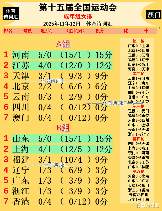 五轮之后,积分榜排名发生变化,分别如下:【A组】1、河南5胜15分;2、江苏4胜12分;3、天津3胜1负9分;4、北京2胜2负6分;5、云南3负0分;4、四川4负0分;5、澳门4负0分。