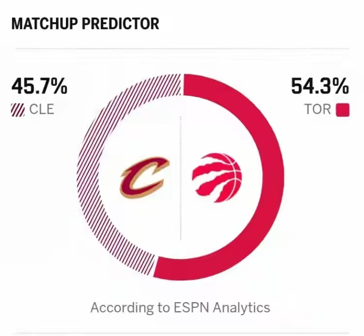 坏消息一:ESPN赛前对本场比赛的胜率进行了预测。认为主场作战的猛龙队有54.3% 的胜率,而客场挑战的骑士队有45.7的胜率。看来ESPN还是非常看好回到主场的猛龙队。毕竟大比分0-2落后之后的猛龙队已经没有了退路。回到主场之后肯定会奋力反扑。背水一战的猛龙队肯定会激发出无穷的力量,这对于骑士队来说,绝对不是好消息。