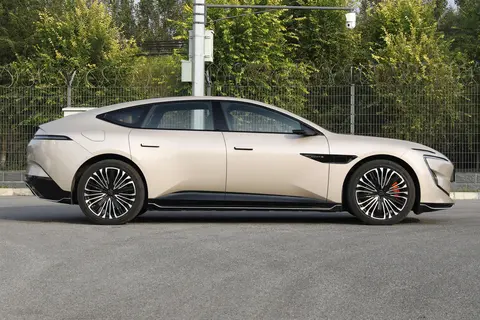 细节处,车头采用碟翼式造型,封闭式格栅搭配蝶翼式 LED 日行灯带,前风挡上方装配上弦月形态的 HALO 显示屏,可显示车辆状态与交互信息。前保险杠下方的主动式进气格栅能根据车速自动开闭,优化散热与风阻。尾部采用开创性无后舷窗掀背设计,搭配智能电动升降尾翼,不仅提升视觉美感,更能优化空气动力学表现。