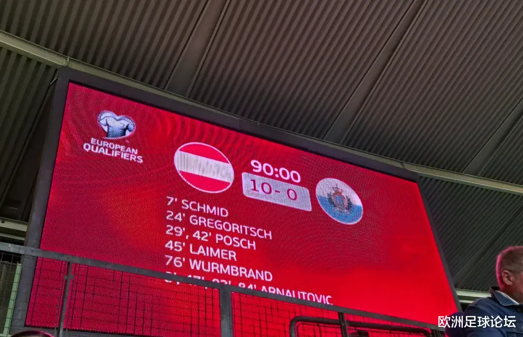 下半场,阿瑙托维奇再轰三球上演帽子戏法,乌尔姆布兰德也斩获一球。最终,奥地利10比0狂胜圣马力诺,以5战全胜积15分的战绩领跑H组。
