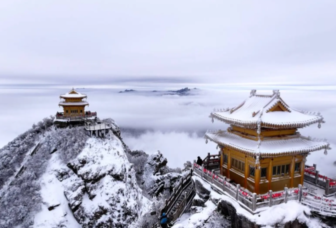 深秋的老君山,一场初雪悄然降临。原本层林尽染的山峦,转眼间被白雪覆盖,金顶红墙在雪雾中若隐若现,仿佛神仙居所自云端垂落人间。