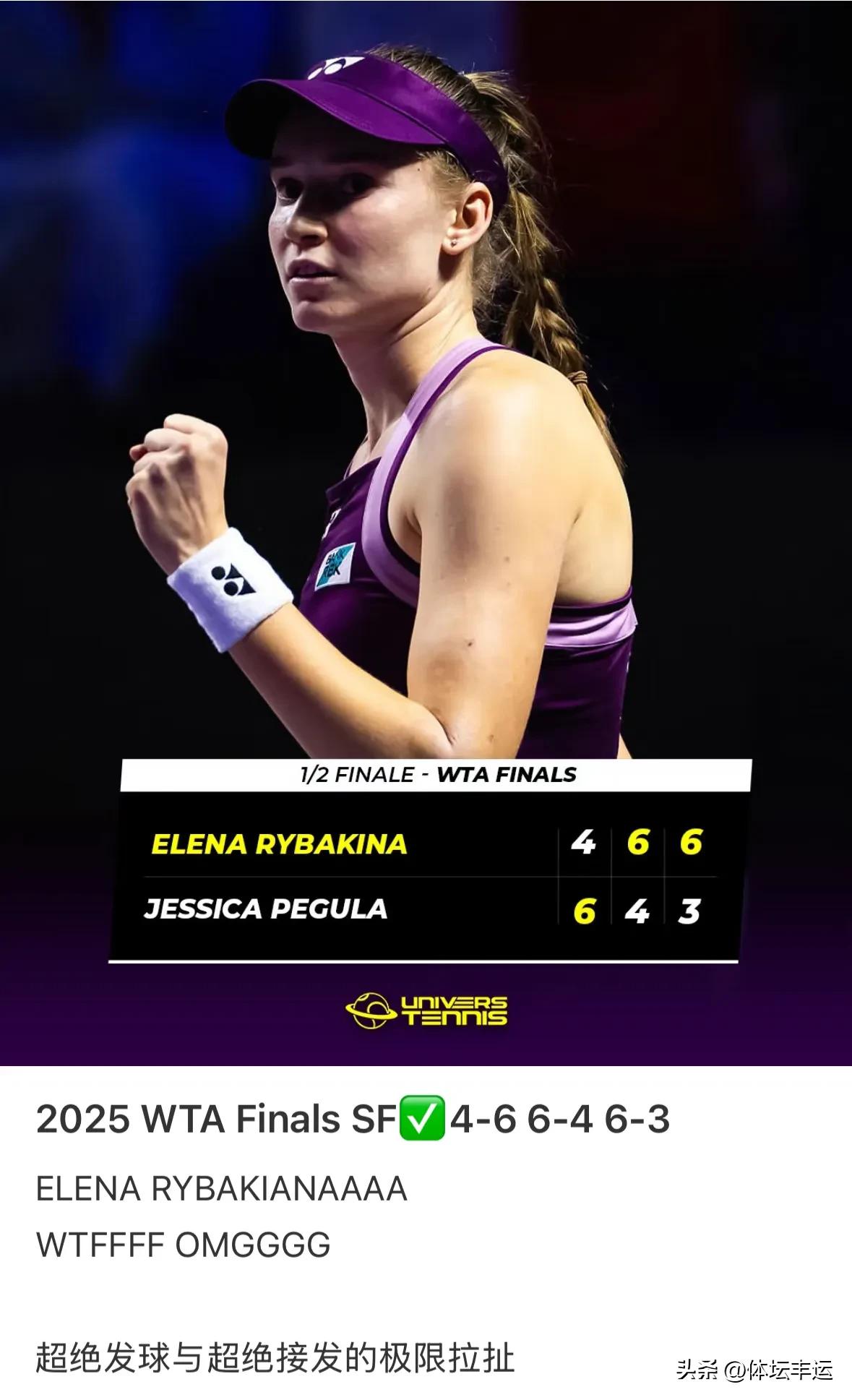 2025WTA年终总决赛女单决赛对阵揭晓,意料之中的双巴大战@萨巴伦卡vs莱巴金娜!刚刚结束的女单半决赛第二场比赛,萨巴伦卡6-3、3-6、6-3战胜阿尼西莫娃锁定决赛席位!此前结束的女单半决赛第一场比赛,莱巴金娜4-6、6-4、6-3逆转佩古拉率先晋级决赛!萨巴伦卡是第一个入围年终总决赛的选手,莱巴金娜是最后一个入围者!