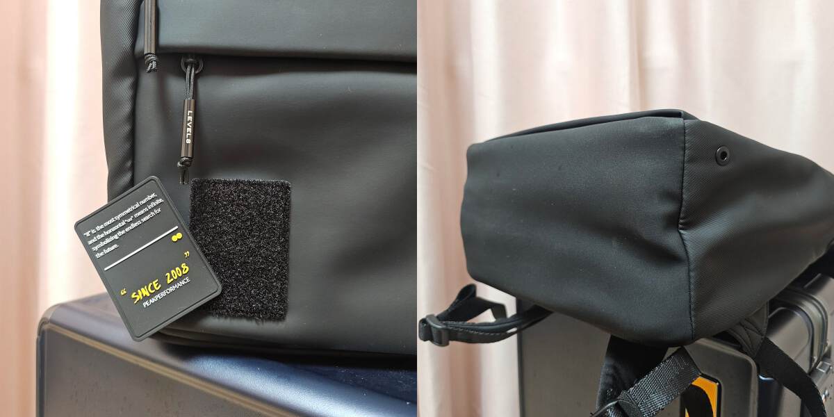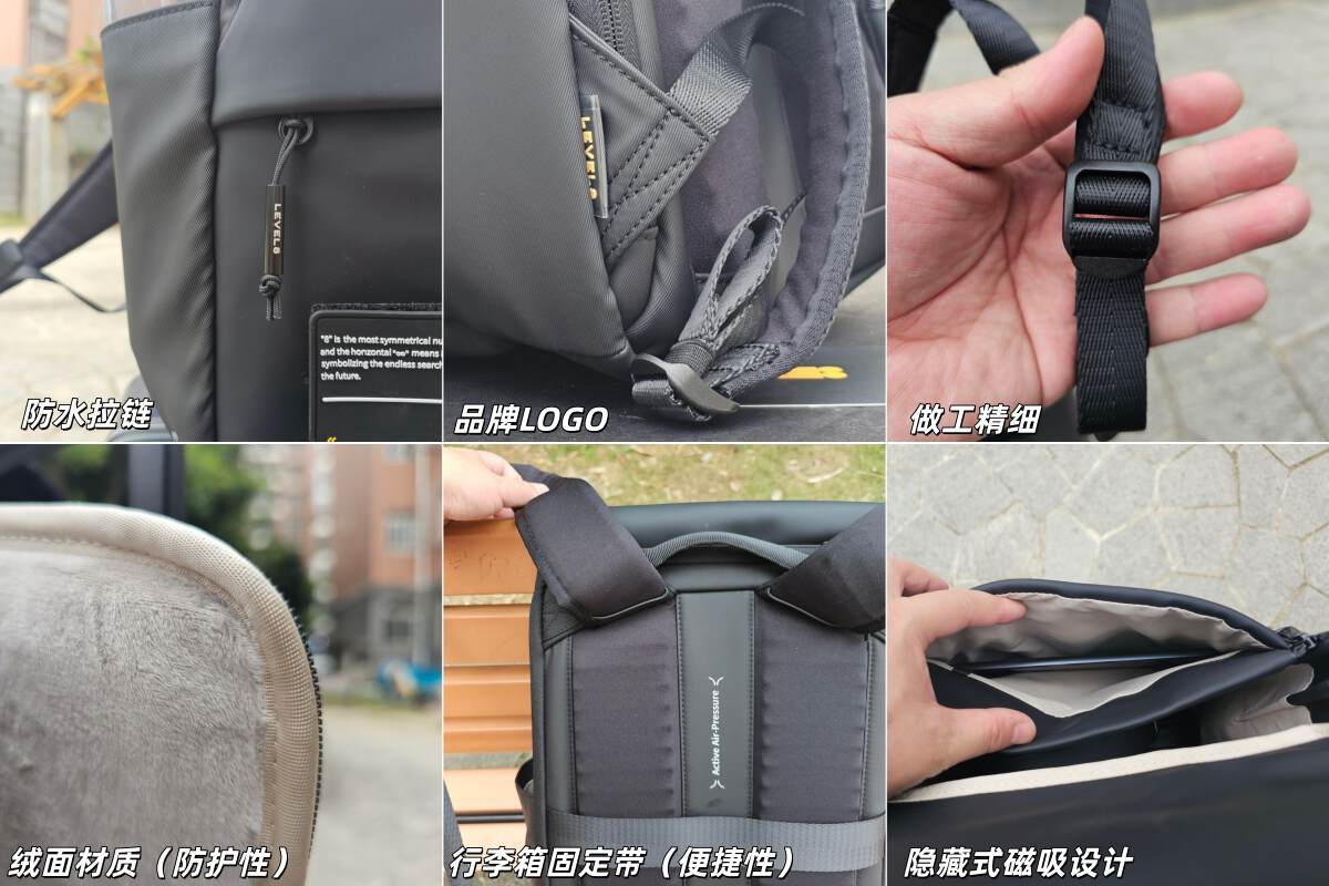 喜欢地平线8号的品牌调性,如同信任他的品质一样。小黄LOGO的细节总能很好的与功能的实用性相结合。如定制的拉环,各区域的拉链均采用防水的设计;放置电脑的区域采用的是浅色的绒面材质,有一定的厚度,能够很好的防护电脑等设备。背部的行李箱固定带,正面小口袋的隐藏式磁吸设计,都是非常实用的设计。