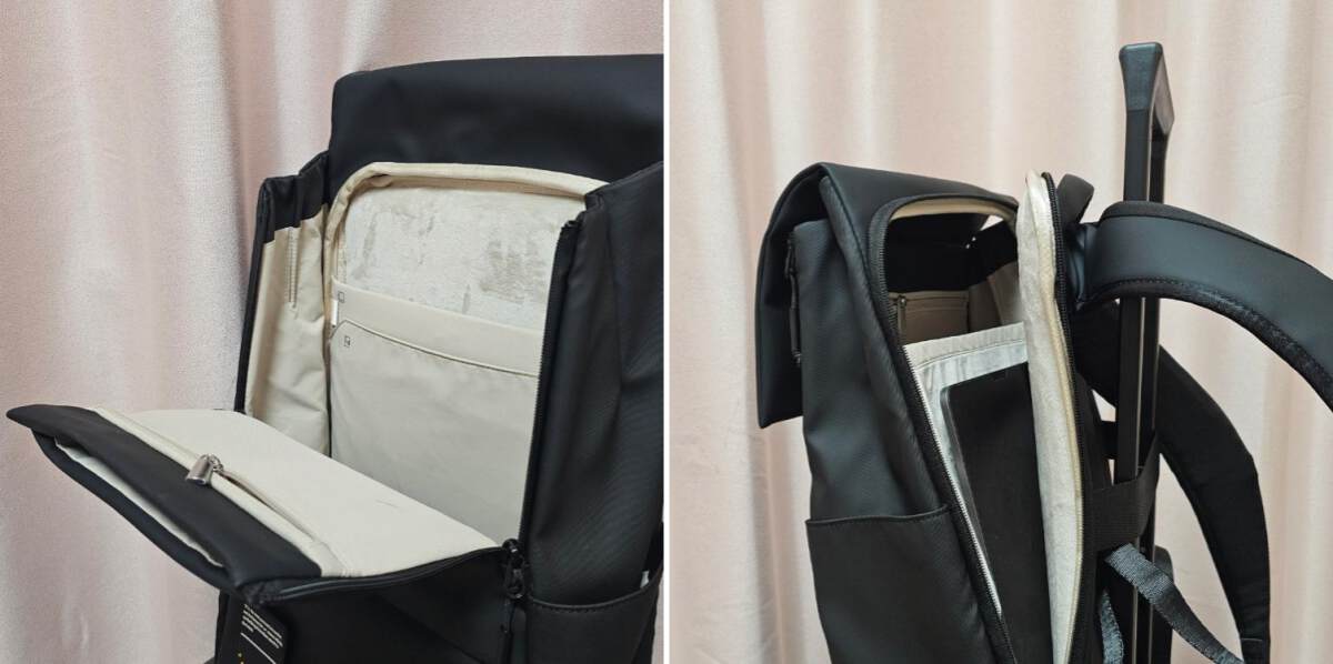 内部收纳:最内层是一个15.6寸的电脑仓,如果是MOMENT系列的mini款,电脑仓的尺寸为14寸。满足目前比较常用的轻薄笔记本的尺寸。外面一层还有一个专门的ipad区,测试放12.9寸的ipad pro刚刚好。ipad旁边还有一个独立的小口袋,测试可以放入一直词典笔,或者作为其他笔的收纳都可以。
