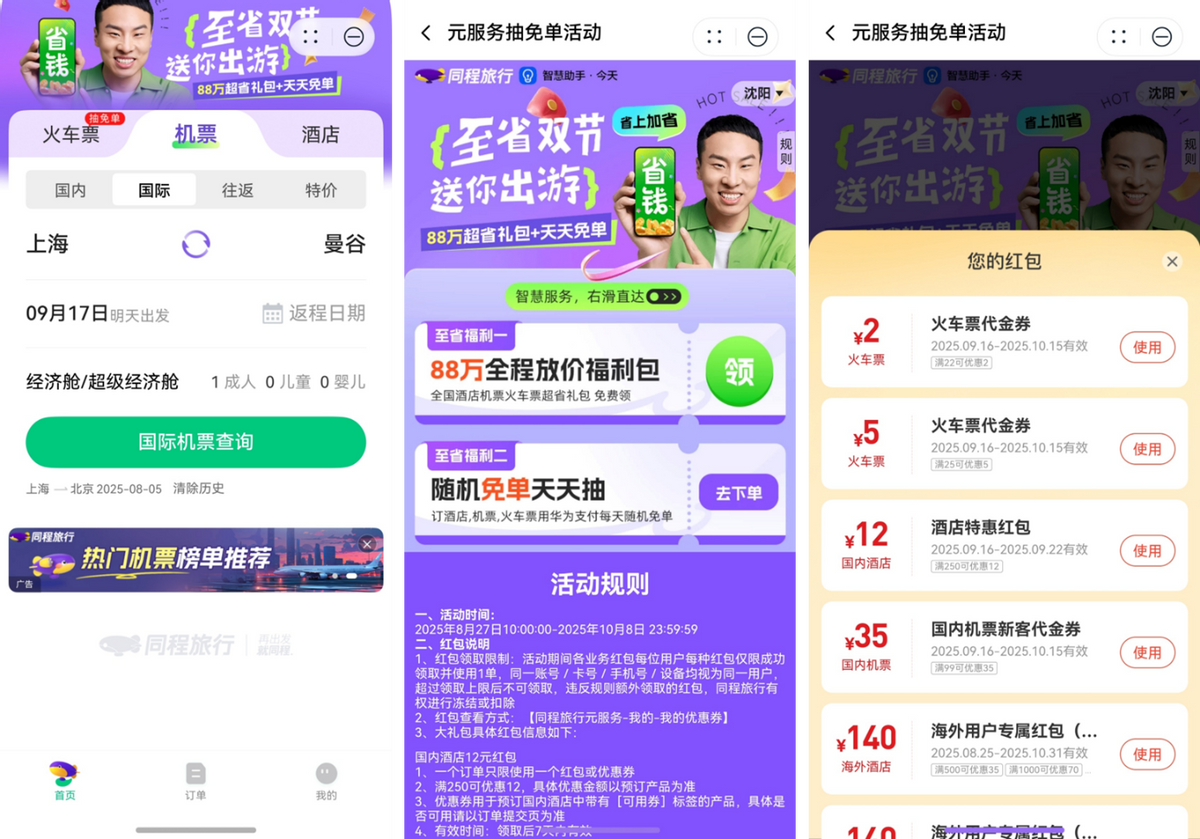 首先要给大家推荐鸿蒙5手机上的负一屏元服务,桌面右滑即可直达负一屏。这里面元服务最省心的就是不用下载安装,点开就能直接用,还不占手机内存。比如你临时想逛周边城市,可以直接使用同程旅行元服务预定高铁/飞机、酒店,华为账号一键登录非常丝滑。现在同程旅行元服务内有全国酒店、机票、火车票超省礼包免费领,包括火车票5元立减券(满6减5)、机票20元立减券(满90减20)和酒店97折优惠券(满100享97折),同时还有随机免单、双人出境游抽奖等重磅活动可参与,国庆还没规划行程的小伙伴可以重点关注下~