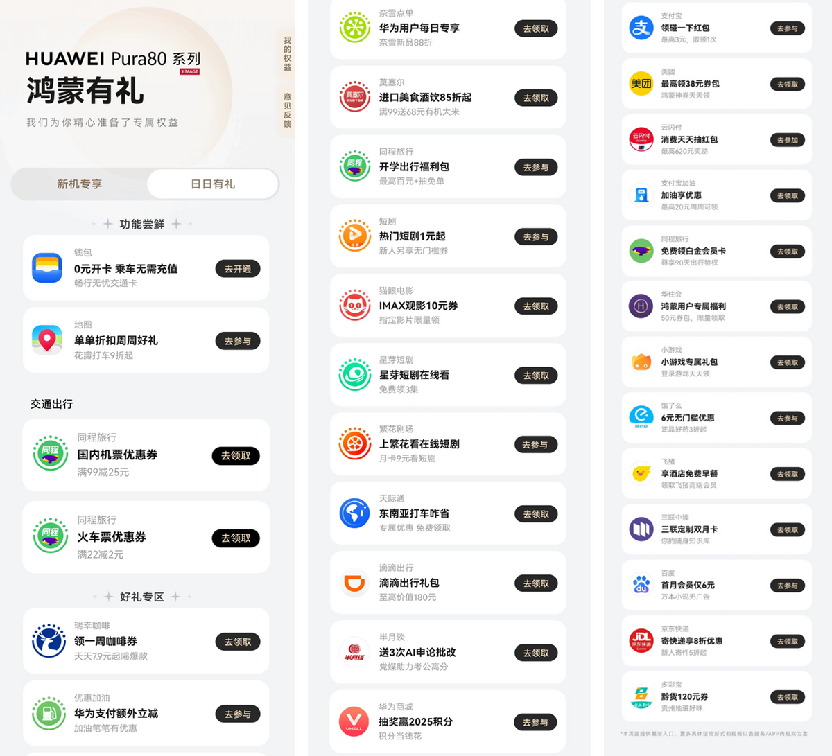 除此之外,华为负一屏里的“鸿蒙有礼”的日日有礼也别错过,每天都能领不同场景的优惠券,不管是出行订票、宅家追剧,还是日常喝奶茶、开车加油,都能用得上。