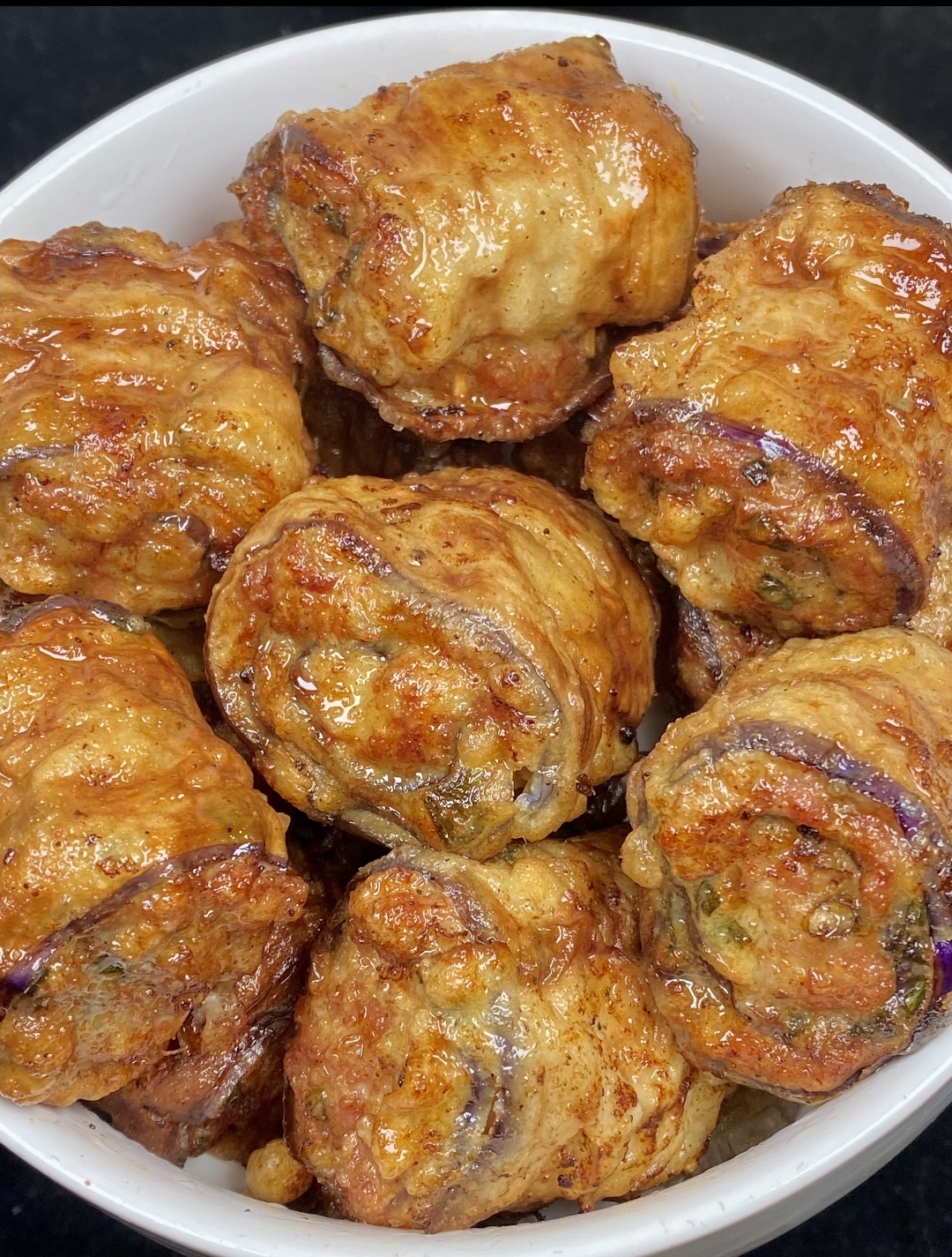 长茄子切成3毫米左右的薄片——记住要“薄但不烂”,太老太厚的茄子片卷的时候会裂。把调好的肉馅均匀抹在茄子片上,从一头慢慢卷成小卷,像给茄子穿了件“肉裙子”,卷的时候稍微捏紧点,炸的时候不容易散。