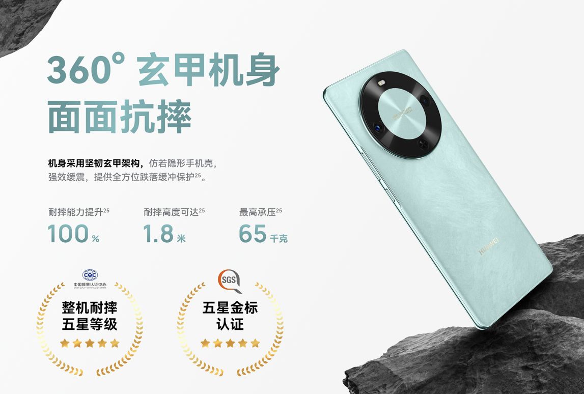 安全性和耐用性是华为畅享 70X另一大亮点。机身采用了玄甲设计,不仅材料坚固,而且屏幕四周被中框包裹,有效降低了意外跌落导致碎屏的风险。得益于这一设计,华为畅享 70X获得了中国质量认证中心和瑞士SGS的双五星耐摔认证,证明了其在抗摔打方面的卓越表现。
