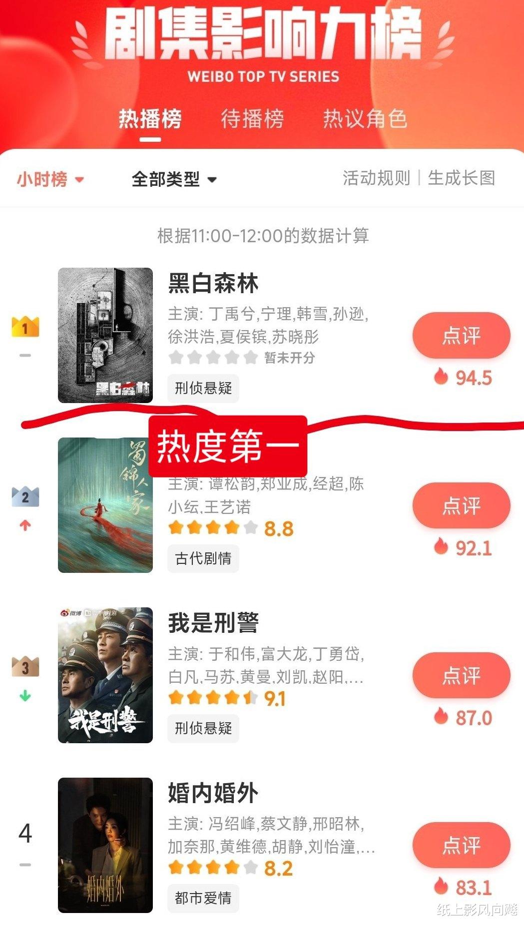 《黑白森林》一经播出便如一颗重磅炸弹,在短短两天内火爆出圈,其站内热度冲破 22000,成为当下热度王者,猫眼热度值高达 9137.91,雄踞网络剧热度榜榜首。