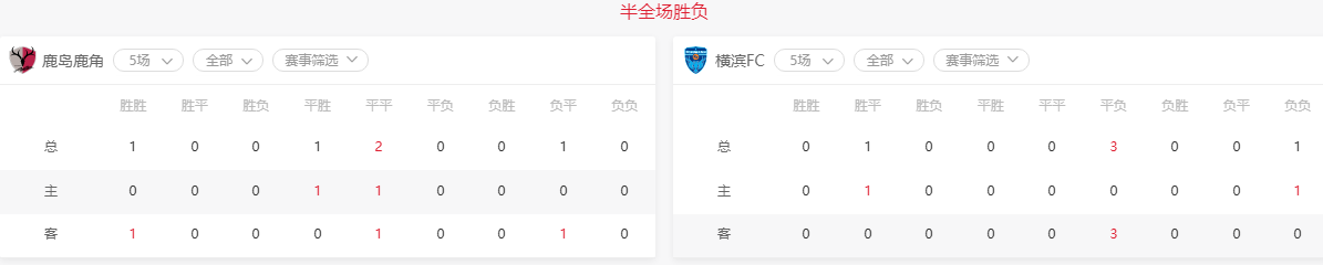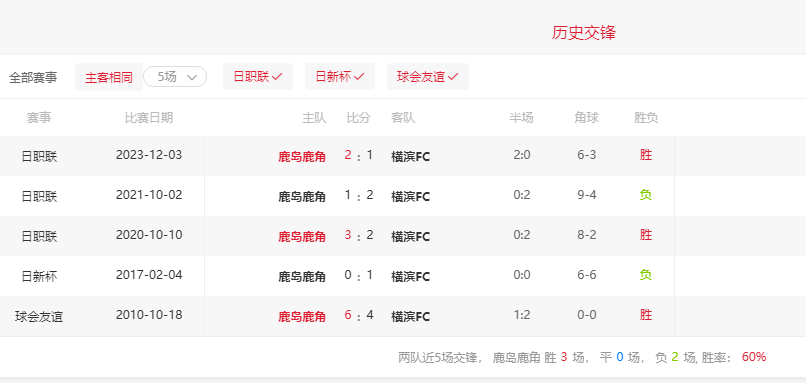 两队近 10 次交锋,鹿岛鹿角取得 6 胜 2 平 2 负的战绩,占据一定优势。在最近的 5 次交手中,鹿岛鹿角更是取得 4 胜 1 负的成绩,其中包括在主场以 3 - 0、2 - 0 等比分战胜横滨 FC,心理层面占据上风。