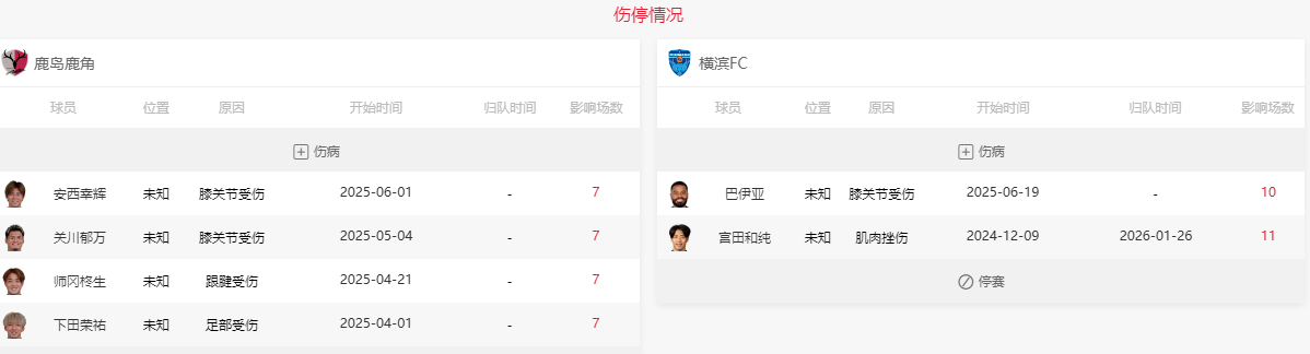 鹿岛鹿角方面,主力后卫安西・幸辉(十字韧带受伤)、关川・郁万(膝关节韧带撕裂)、森田・修(跟腱撕裂)以及中场下田・义弘(膝关节内侧韧带撕裂)因伤缺阵,这对球队的后防线和中场防守硬度有一定影响。