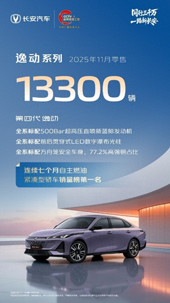 12月初,长安汽车发布最新销量数据显示,逸动系列11月零售13,300辆,连续第七个月蝉联自主品牌紧凑型燃油轿车销量冠军,稳居细分市场榜首。其持续的强势表现,不仅印证了“国民家轿”在智能化与综合实力全面进阶后的蓬勃生命力,更以坚实的市场基盘,为12月10日“中国长安成为最快达成中国品牌3000万辆的汽车企业”这一里程碑,贡献了重要力量。