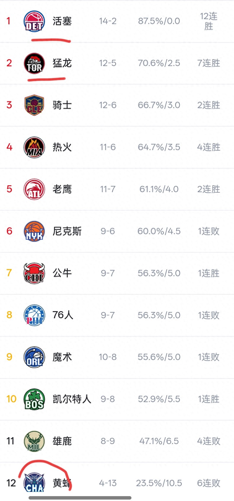 活塞12连胜,东部第一,猛龙7连胜,东部第二,两位多年卡在炼气期瓶颈的道友,突然筑基了!而黄蜂这位老弟,独吞6连败,排在东部倒数第三,还是炼气期弟子,一点长进都没有。