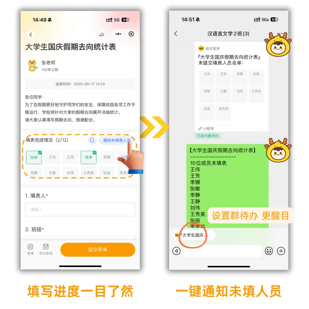 现在,无需再对着名单一个个核对了,使用接龙管家「按名单填写」功能,就可直观查看接龙进度(绿色代表已完成,灰色代表未完成),未接龙人员清晰可见,并支持一键提醒,转发到群聊。