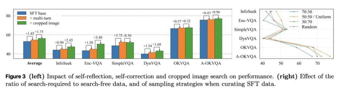 在搜索平衡的 SFT 数据中(即从所有知识分类中均匀采样样本的情况),模型表现更优。苹果首先在 SFT 数据中通过不同的「需要搜索」与「无需搜索」样本比例进行消融实验,以研究其对性能的影响。从图 3(右)可以观察到,当需要搜索的问题比例较高时,微调后的模型会表现出过度搜索的行为,并在 OK-VQA 和 A-OKVQA 等需要较少搜索调用的数据集上表现较差。